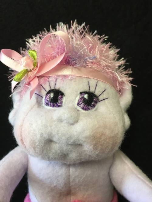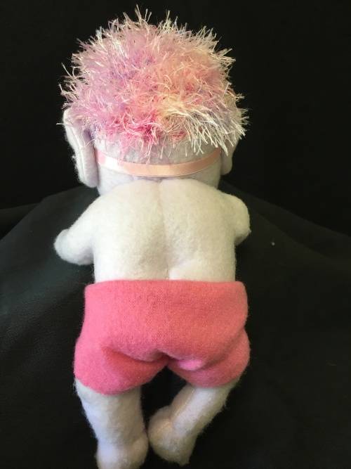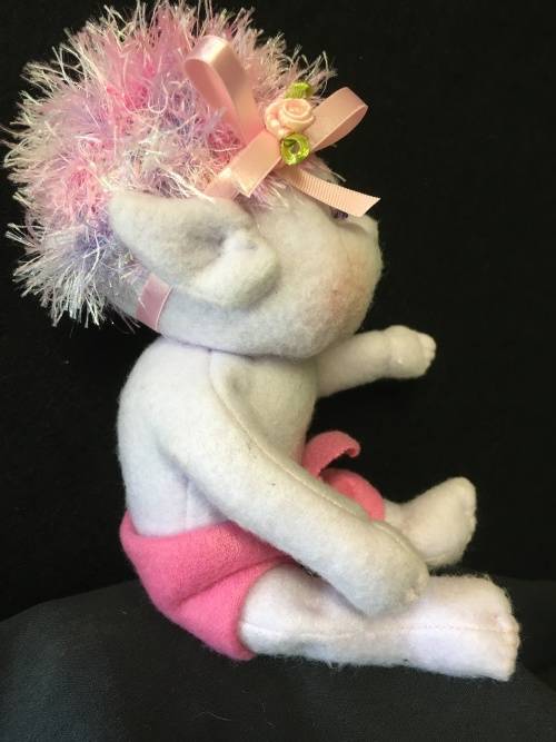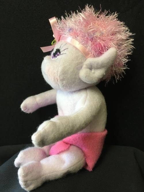 The soft plush pixie is about 20 cm from head to toe. She is a soft purple color with pink and purple multi-colored hair. She was handmade by Karen Lee from Karen Lee Creations in the USA. She was never played with only displayed.