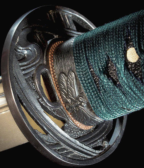 Most noticeable are the distinctive teal-green silk cord-wrap and black sameé (ray skin) used on the handles and the black iron furniture that bears the dragonfly motif. Also, the polished blades are more strongly curved than our Emperor blades and terminate in a long "iris leaf" point for maximum cutting and slashing potential. Additionally, these swords come with two protective bags. There is a BLUE TRAVEL BAG and an intricately decorative display bag that's made from the finest heavy silk metallic brocade.