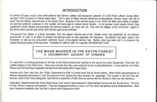 Small softcover edition (c1995) containing the original German report on findings of the Soviet massacre of captured Polish officers in Katyn Wood during 1940, which had been suppressed up until the fall of Communism. Also the photographs with captions that accompanied the report plus an English translation of same. 48 pages. Good condition. Courier R80.00.
