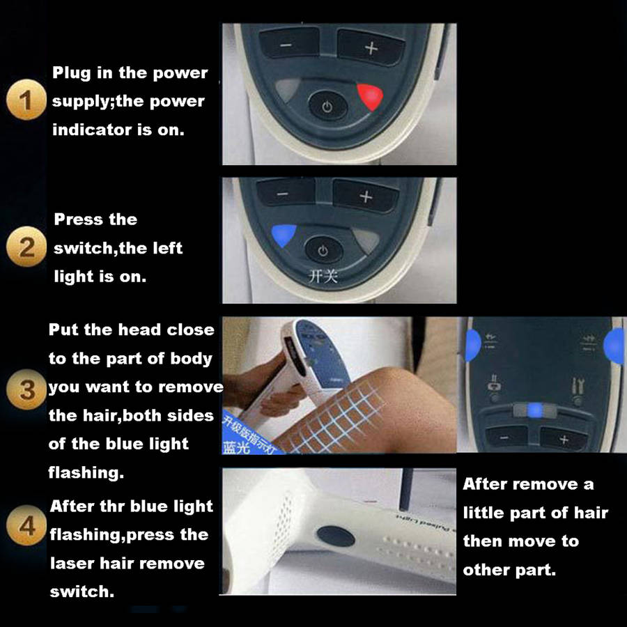 Using Method: 1) First plug in the power, the right side of the indicator light is red, and then press the start button will switch to the left light, turn into a blue light, this time indicates that the product has been normally started. 2) Laser head on the skin, to be left and right on both sides of the indicator light flashes, means the product is ready, press the button on the handle to work. 3) + / - button to adjust the intensity.