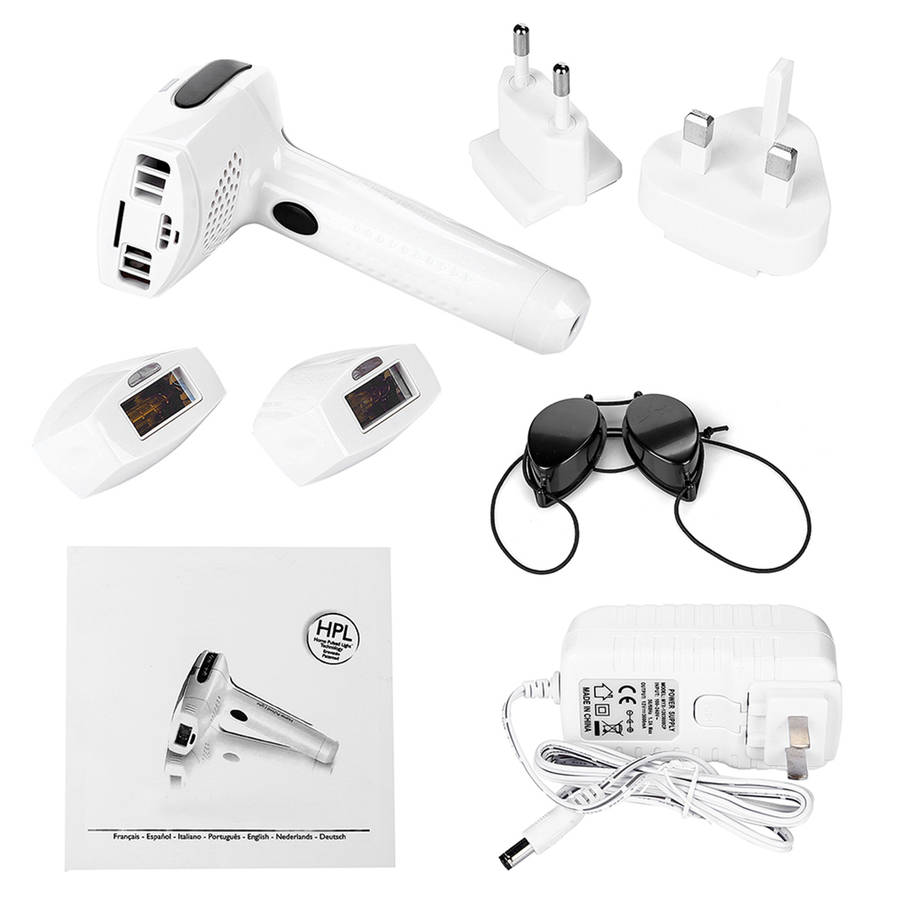 Package Included: 1 X Laser Hair Removal Remover 2 X Pcs Laser Hair Removal Head 1 X Pc Multi-Voltage Charger 1 X Pair Glasses for Eyes Protective 1 X Pc English User Manual
