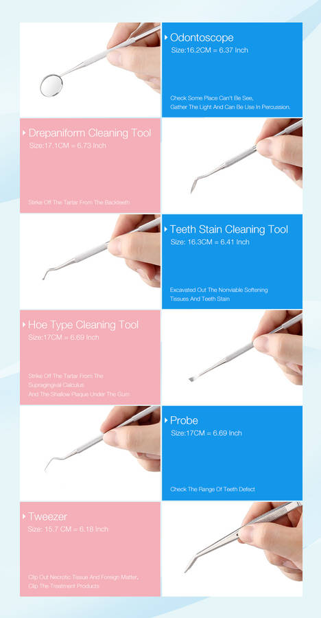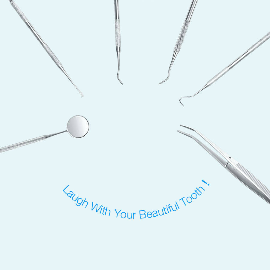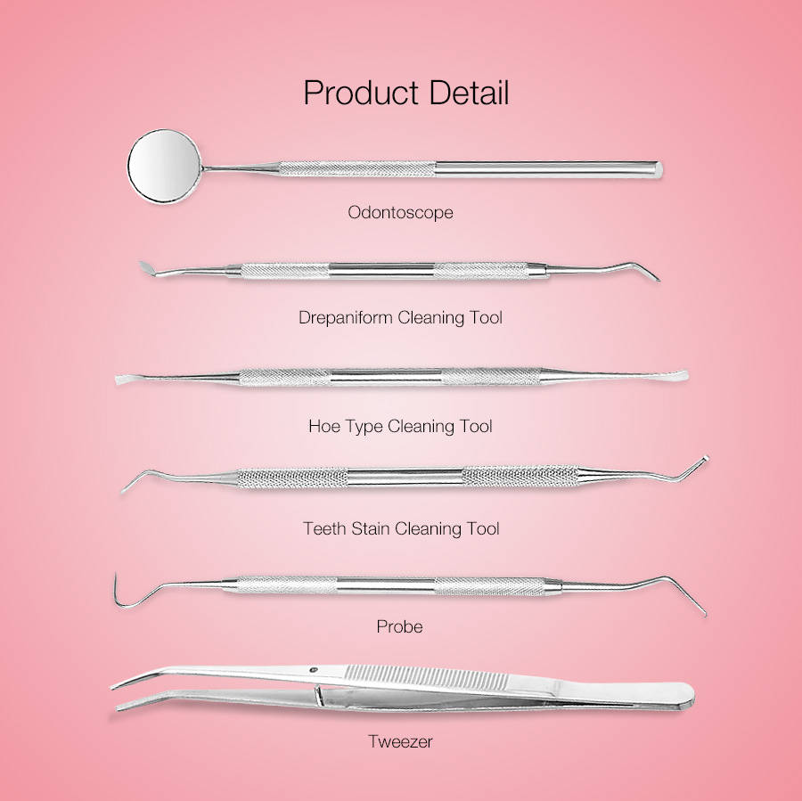 Types: 1. Odontoscope 2. Tweezer 3. Hoe type cleaning tool 4.Dental probe 5. Drepaniform cleaning tool 6. Teeth stain cleaning tool 7. Complete Kits