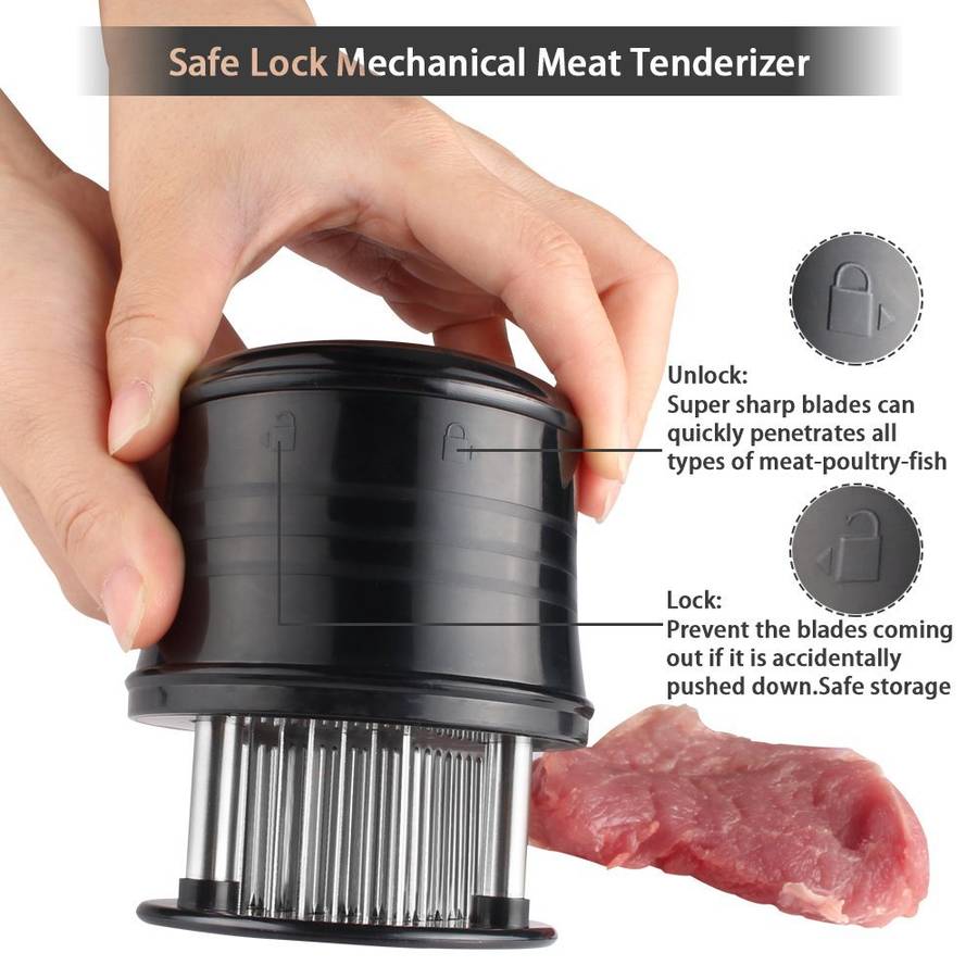 Made of food grade material, 56 stainless steel blades and ABS plastic.Tenderizer has a Lock Mechanism for safe storage and usage.