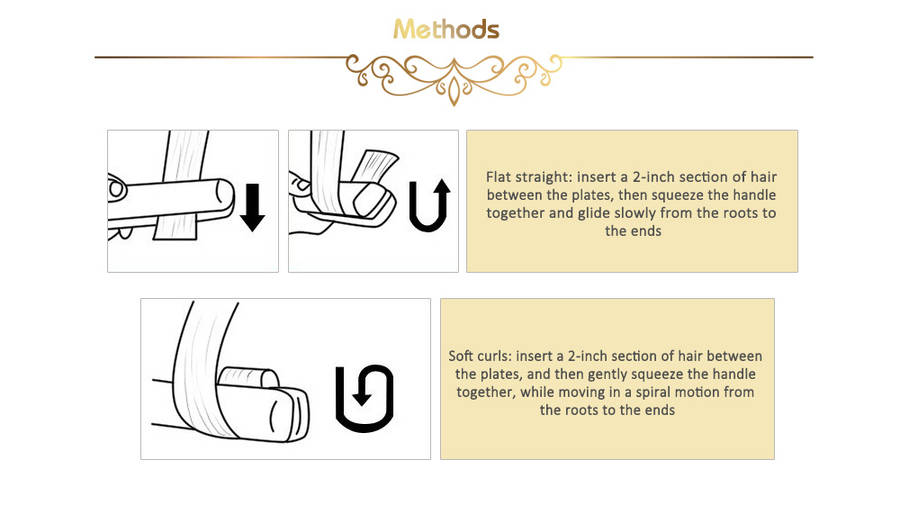 Take some hair in hand, insert a 2-inch section of hair between the plates, then clamp and pull them from the roots to the ends slowly for 10 seconds at most.