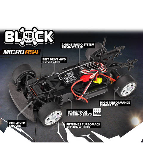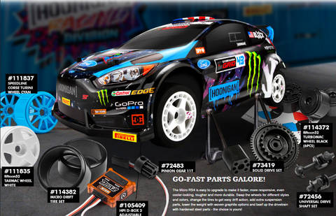 The HPI Micro RS4 is powered by an HPI 180-size motor and also features real rubber racing tires, quick-swap battery holder, an electronic speed control, full time 4WD belt drive and a waterproof steering servo. It's ready to blast around race tracks just like Ken Block's full sized Ford Fiesta RX43!