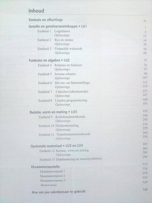 2008 sagteband 348 bladsye, klein merkies aan sagteband, versending R35 in RSA. n Studiegids wat die uitslae sal verbeter, sluit in: n inleiding tot en bespreking van al die temas wat in Graad 12 wiskunde gedek moet word, volledig uitgewerkte voorbeelde met hulle antwoorde, oefeninge en vrae om jou vaardighede en kennis te oefen, voorbeeld vraestelle, toetse met antwoorde.