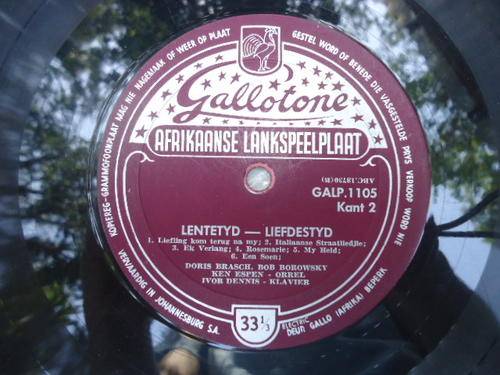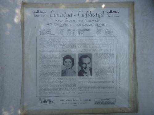 On offer is this KEN ESPEN & IVOR DENNIS "LENTETYD-LIEFDESTYD" GALLOTONE LONG PLAY LP SUPPLIED WITH A PLASTIC COVER IN V/GOOD CONDITION WITH THE VINYL SHOWING A VISIBLE HAIRLINE SCRATCH MARK ON SIDE 2 AND THIS COVER IS IN V/GOOD CONDITION WITH A TEAR IN THE MIDDLE OF THE OPENING EDGE AND SUPPLIED IN A PLASTIC COVER.