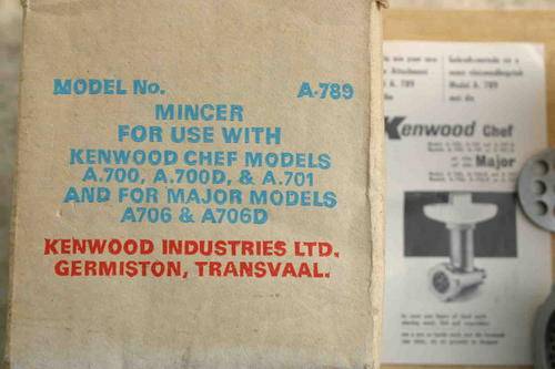 KENWOOD Mincer A789 for use with CHEF and MAJOR. Excellent complete condition with instruction booklet, appears unused. Postage R50.