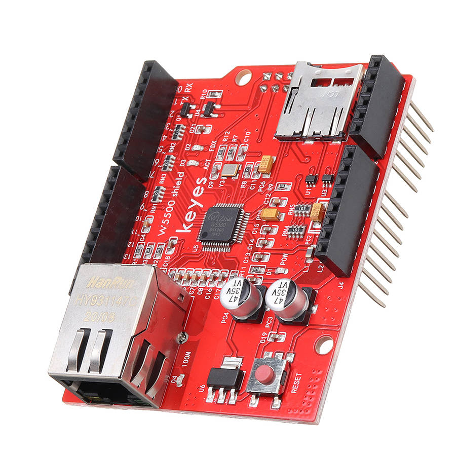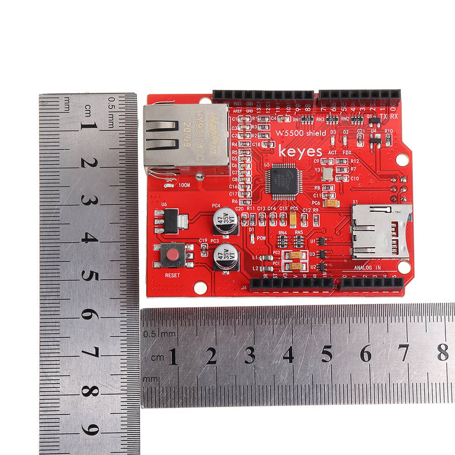 Feature: W5500 network shield comes with W5500 network module as core. It can make as simple Web server, or write and read the High/Low level of digital pins, or analog value of analog pins via network control. It is compatible with both keyestudio UNO R3 and Mega 2560 R3 development board. When using, stack the W5500 shield onto UNO board, and upload the program to control board, which can make a simple Web server. You can quickly make your controller access to internet to build your network application. At the same time, it also supports mini SD card (TF card) read and write. You can direct stack the W5500 Network shield onto control board, or stack other expansion boards on this Network shield. The shield has four 3mm fixing holes, easy to mount on any other devices. Technical Parameters: Input voltage: DC 5V Working voltage: DC 3.3V Working current: about 380mA Maximum power: 3W Working temperature: -55a ~ +75a Network transformer interface type: RJ-45 Female header pitch: 2.54mm TF socket: self-popping Fixed hole diameter: 3mm Dimensions: 65mm*50mm*27mm Weight: 25g Package includes: 1 x W5500 network shield
