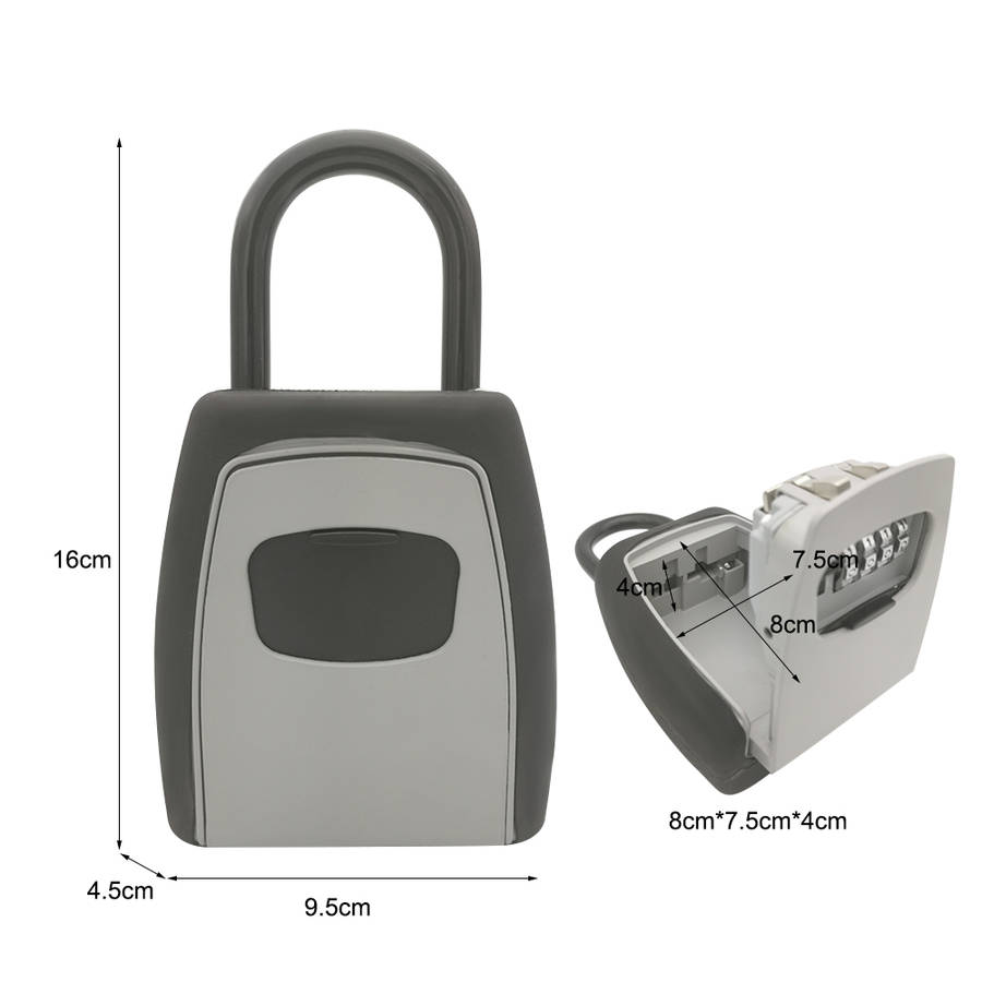 Feature: Over the door knob design for portable installation. Large internal cavity prevents jamming, even when holding multiple keys. Set your own combination convenience for optimal security. Set your own 4-digit combination for keyless convenience and increased security. Protective weather cover prevents freezing and jamming. Molded body and vinyl coated shackle prevent scratching. Specification: Model Number: MH904 Material: Aluminum Alloy + Zinc Alloy Color: Grey Internal Space Size: 75 x 80 x 40mm/2.95 x 3.14 x 1.57in Item Size: 160 x 95 x 45mm/6.29 x 3.74 x 1.77in Package Size: 17 x 11 x 5cm Package Weight: 594g/20.95oz Package Included: 1 x Key Storage Lock Box 1 x User Manual Details Pictures: