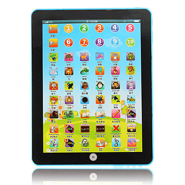 Features: 1. Multi-functional modes -- 18 different fuctions 1) Multi-stage volume adjustment; 2) Number: 1-10 (Chinese & English), each number stands for a song (when in the music mode); 3) Letter: alphabet voice exercises for 26 letters; 4) Word: vocal exercises for 26 English words; 5) Spelling: spelling exercises for 26 English words; 6) Find letters: Press -- Find the letter -- Found (praise)/ Not found ("please try again"); 7) Reading digital: Press -- Choose one number (1-10) -- Read after the machine; 8) Find numbers: Press -- Find the number -- Found (praise)/ Not found ("please try again"); 9) Plus Formula: Press -- Find the answer -- Right (praise)/ Wrong ("please try again"); 10) Minus Formula: Press -- Find the answer -- Right (praise)/ Wrong ("please try again"); 11) Multiplication Mouth Summary: Basic ones, like 1x1=1; 12) Division: Basic ones, like 2/2=1; 13) Reading letters: Press "Letter" -- Choose a letter -- Read after the machine; 14) Find word: Press -- Find the word -- Found (praise)/ Not found ("please try again"); 15) Learn phonics: Press -- Choose a picture -- Read after the machine; 16) Scale/ Electronic organ : Press "Scale" , then choose different numbers (7 numbers altogether) to play; 17) Listen music: Press "Listen music", then choose any picture (one song for one picture -- about 30 popular songs for children; 18) Chinese/ English: 1st press -- Chinese; 2nd press -- English. Note: A second press is needed for each function to operate. 2. Funny ways (animal calls, scale,etc) are provided for children to learn letters, words, songs, etc. 3. 8 different learning modes, more powerful. 4. Portable (only 1.8 cm thick), gentle press, easy for children to operate. Specifications: 1. Color: Blue 2. Power by 3 * AAA batteries (Not included) Package include 1 x Multi-function Learning Touch Computer Note: This is only a plastic children's educational devise, not a real i-pad. You can only press the screen, but the screen does not light up or change.