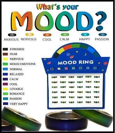 A mood ring is a ring that contains a thermo chromic element, such as liquid crystal that changes colors based upon the temperature of the finger of the wearer. The ring indicates the supposed mood of the wearer based upon the colors indicated on the ring example Deep Black and Black means stressed or Fear, Yellow a little Nervous, Green means Passion or Light green Romance, Purple means very HaPpY while light blue simple means you are relaxed. Rings change colour slowly throughout the day and is ideal for kids. For Adults see online for Quick Fast changing range of mood rings