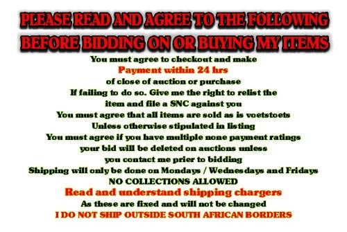 R65.00 Standard shipping applies to orders under R100.00, in most areas in South Africa. R35.00 Standard shipping applies to orders over R100.00. Some areas may attract a surcharge surcharge. This will be calculated at checkout if applicable.