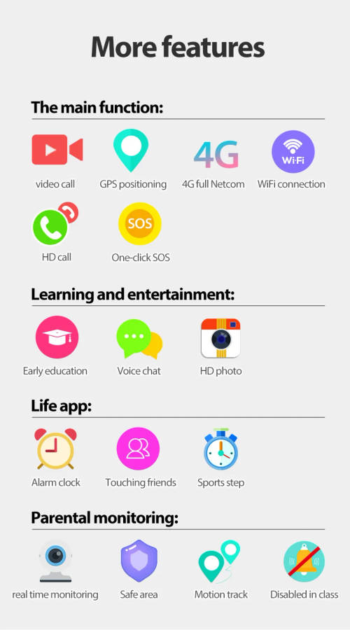 Phone book, SOS/family number, micro chat, positioning, class disable, curriculum, remote photos, video chat, voice monitoring, power saving mode, switch Settings, looking for a watch at night, time switch machine, equipment, alarm clock, footprint, safety area, work mode, family members, reset the device, remote restart, remote shutdown, account cancellation