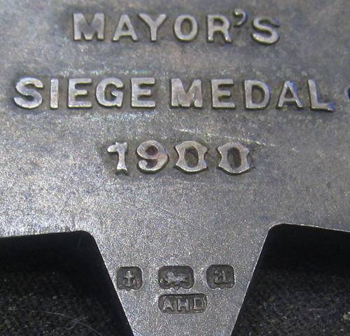 Reverse: Across 'MAYOR'S SIEGE MEDAL 1900' : Stamped below with the Birmingham maker's hallmarks for 1900-01 (a) in this case ---- other one is 1901-2 (b)Below that the abbreviated maker's mark 'AHD'