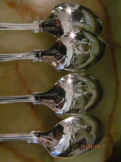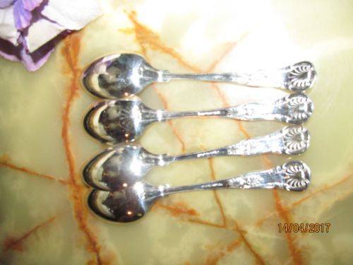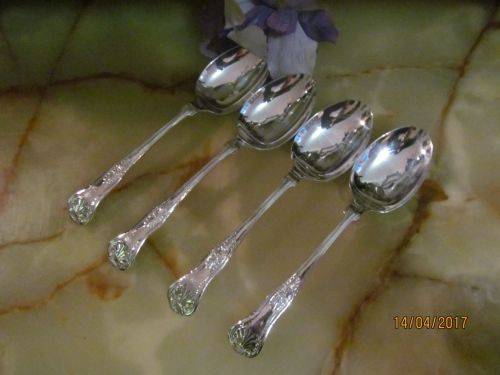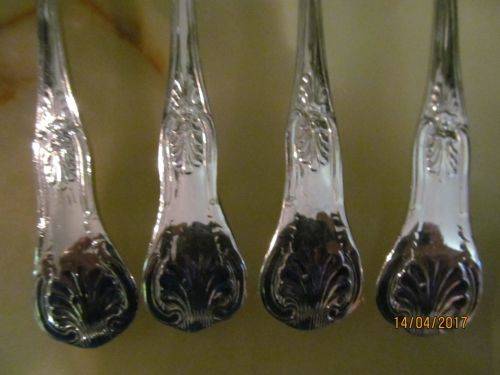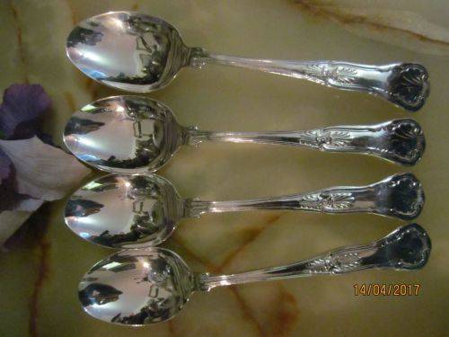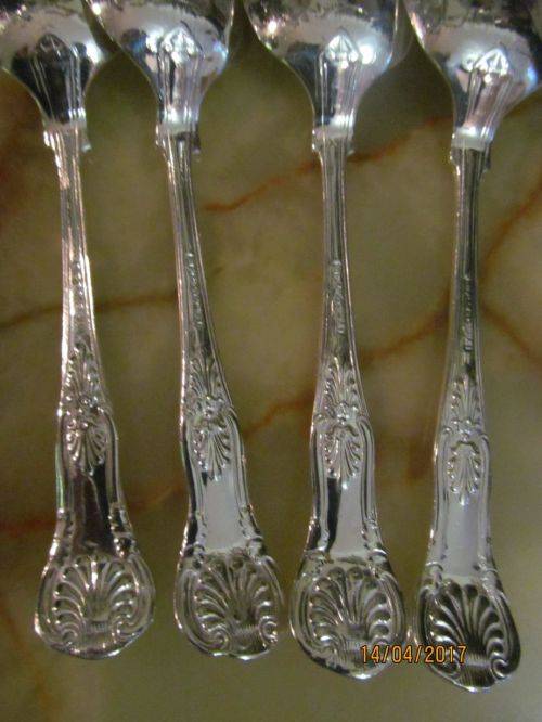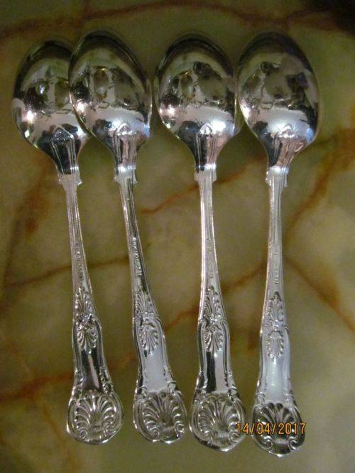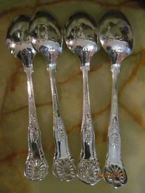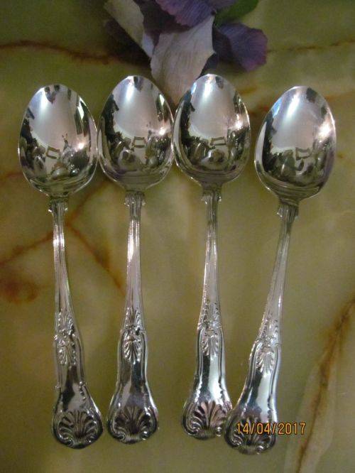 AN IMMACULATE AND PRISTINE SET OF FOUR COLLECTABLE SILVER PLATED DESSERT SPOONS BEAUTIFULLY ADORNED WITH THE SOUGHT AFTER KINGS PATTERN UPON THEIR SPLENDID HANDLES.