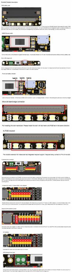 Instrductions: aRobotbit is an excellent robotic expansion board specially designed for Microbit by KittenBot team. aIt has a powerful ability to drive DC motors, stepper motors, servos, and onboard buzzer and RGB pixels and release all valid IO from microbit, with support the most common electronics module in the market. aIt comes with 18650 battery holder, integrated lithium battery boost, charging and protection chip. aSupport for external power input. aMechnically support for KittenBot robotic chassis and LEGO technical slots. aThe powerful drive capability and built-in battery make DIY more convenient and free. aWe have received unanimous praise from the school teacher training institutions and individual enthusiasts. aIt is an excellent choice for your robotic projects based on Micro:bit! aDoes the product need programming software What kind of programming software is required aYes, it needs the programming software. Makecode can work at it. aThe 3D printed protective case can suit for this board.