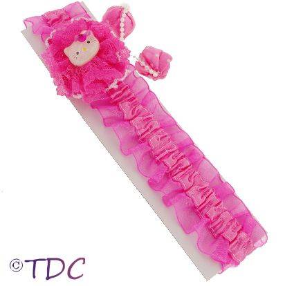 | Material | Satin and organza stretchy band. It is 36cm circumference (unstretched) and 3.5cm wide. |