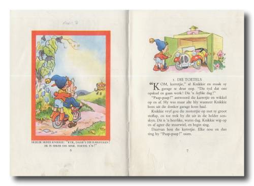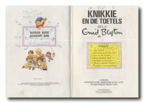 KNIKKIE en die toetels (nr 7) deur Enid Blyton (1962). A5, hardeband met stofomslag, 60 bls. Stofomslag redelik verweer. Boek binne in goeie leesbare toestand. Eerste 2 blaaie het pen naam en van en tekeninge op.