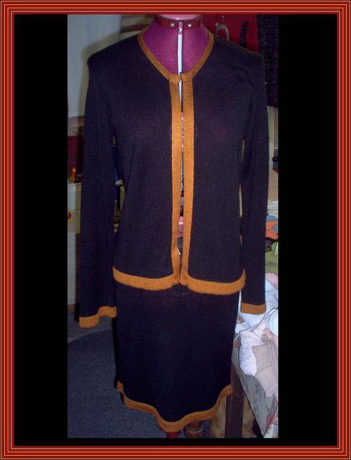 THIS CHIC AND SMART SUITE IS A 3 PIECE CONSISTING OF A 3 STRAND LONG SLEEVE JACKET AND ADJUSTABLE KNEE LENGHT SKIRT WITH MATCHING 2 STRAND VEST AND CONTRASTING COLOURS
