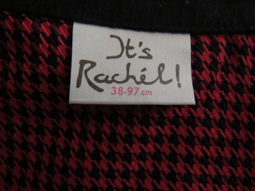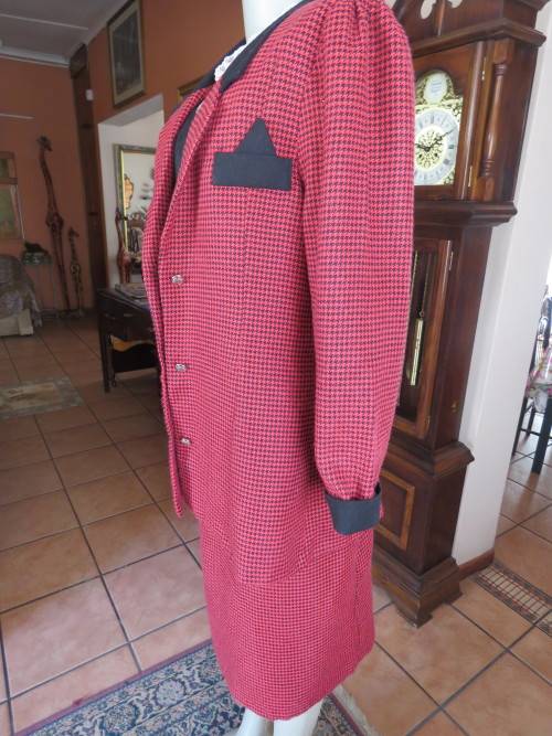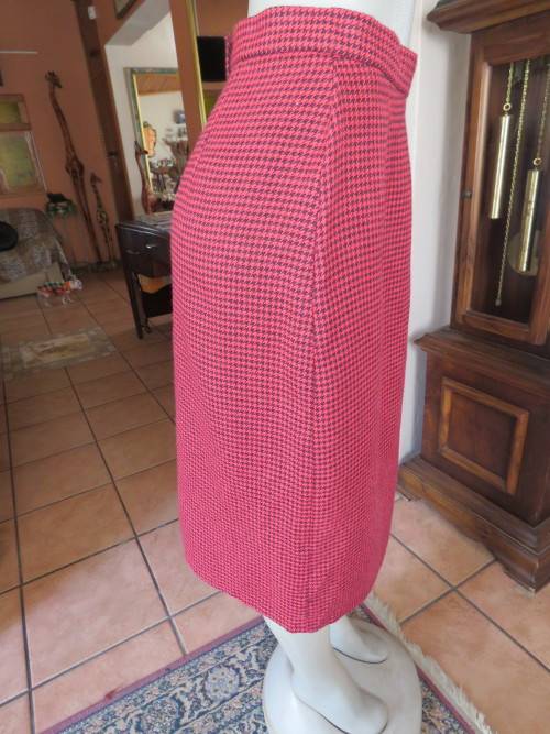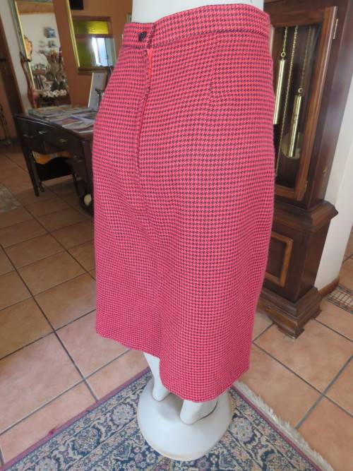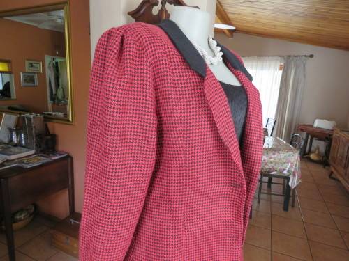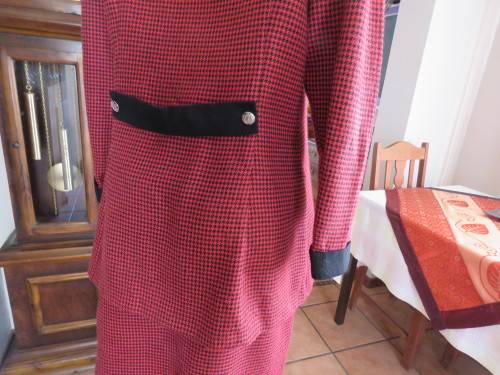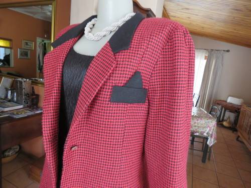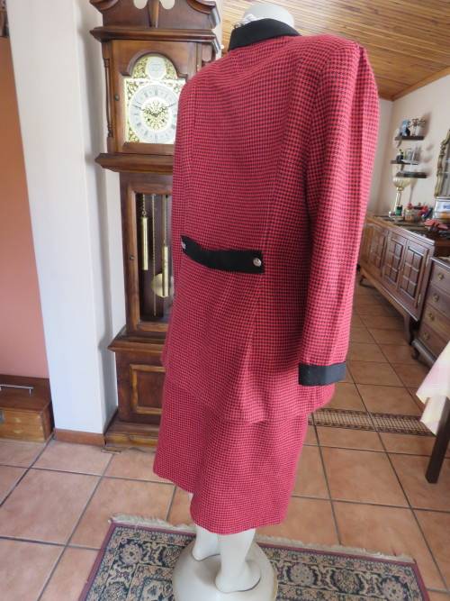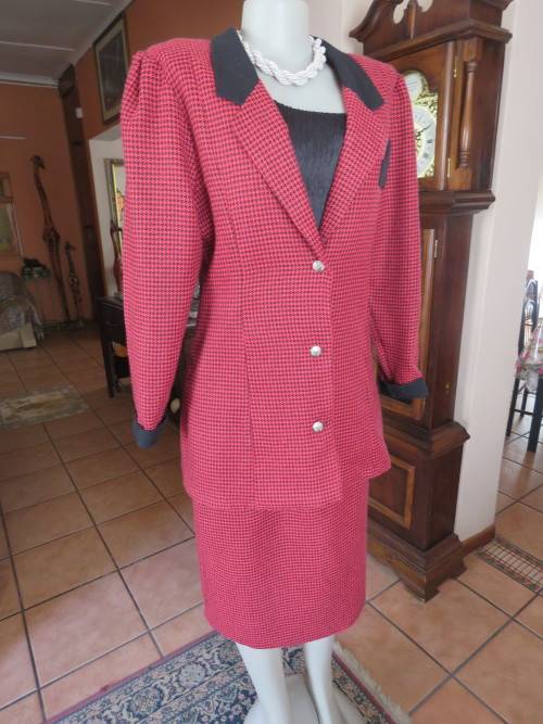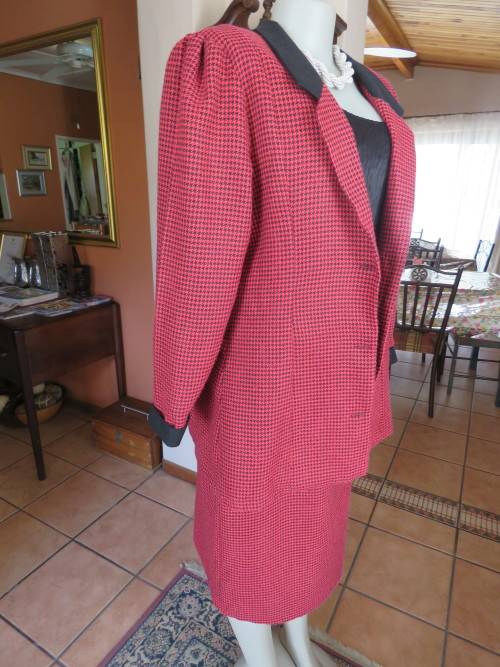 Knockout red/black houndstooth check 2 piece skirt suit by 'IT'S RACHEL' in 38/14.Pencil skirt with slit at back.Long jacket closing with 3 buttons on front.Open collar,partly black cuffs and dummy pocket.New condition.