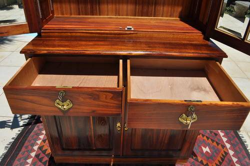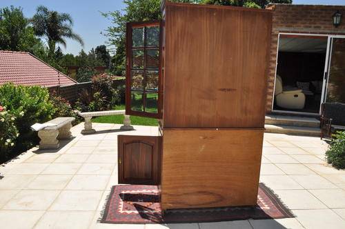3 Adjustable glass shelves, 1 wooden shelf. Beveled glass windows.