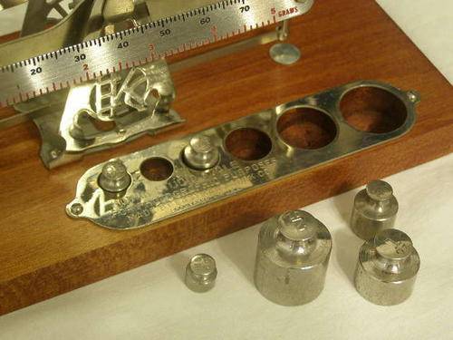 The scale has six weights: 2oz; 1oz; 0.5oz; 0.25oz; 50GR.; 50GR.