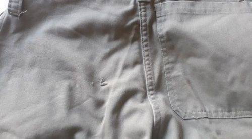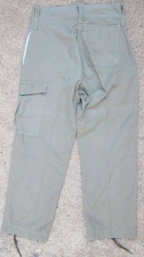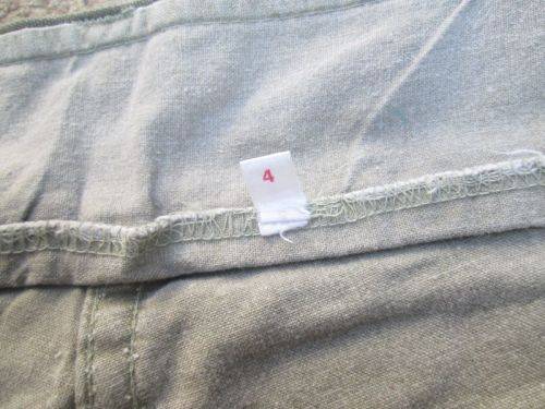 Good original condition with two small holes. All buttons intact. Small hole in back left. Assume that the stains are not protein-based and will wash out. Labelled as a size 4. Waist is 80cm; length of inseam is 72cm. Tracked postage is R75.00.