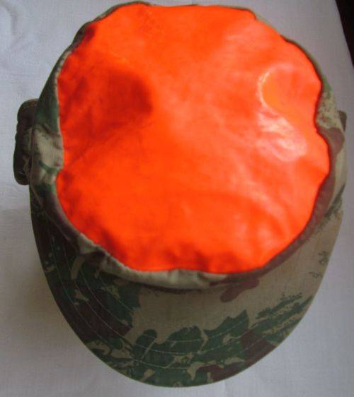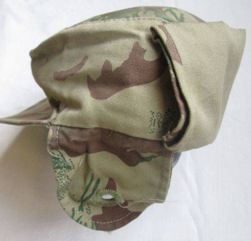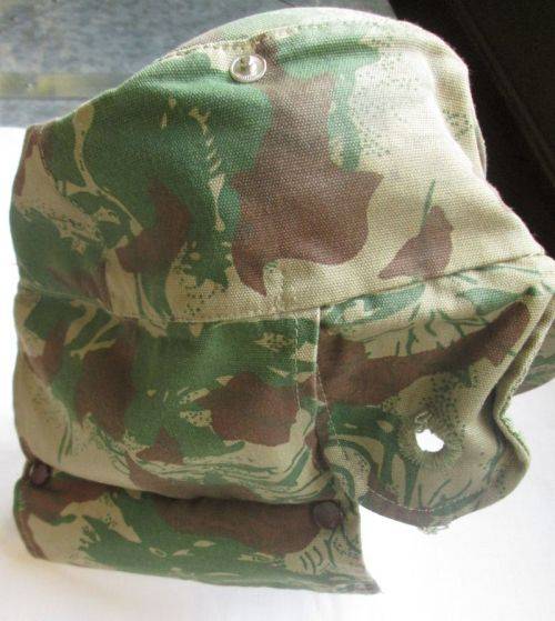 Obsolete Koevoet/SAP camo bush hat with embroidered badge, neck flap and ear muffs. Excellent field-used condition; tie strings have been cut off. DayGlo patch for air recognition intact. Medium size (approx. 54) Tracked postage is 45.00.