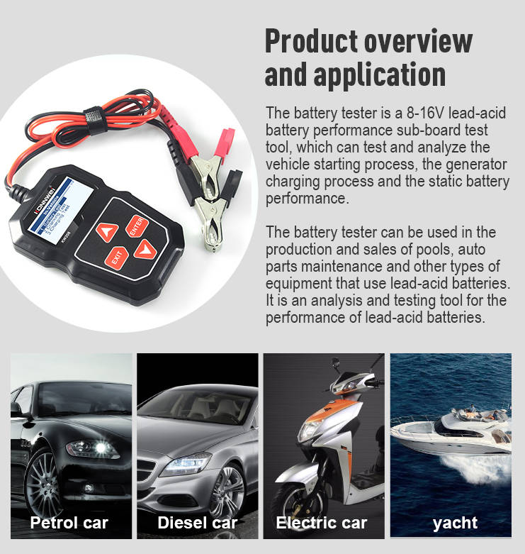 10.Measure Standard ,CCA 100-2000 ,BCI 100-2000 ,CA 100-2000 ,MCA 100-2000,JIS 26A17-24SH52 ,DIN 100-1400 ,IEC 100-1400 ,EN 100-2000 ,SAE 100-2000,GB 100-1400,System Voltage 12 Volts ,Input Voltage Range 8V-16V ,Power Requirements are no internal batteries required,Power on when hooked up during testing