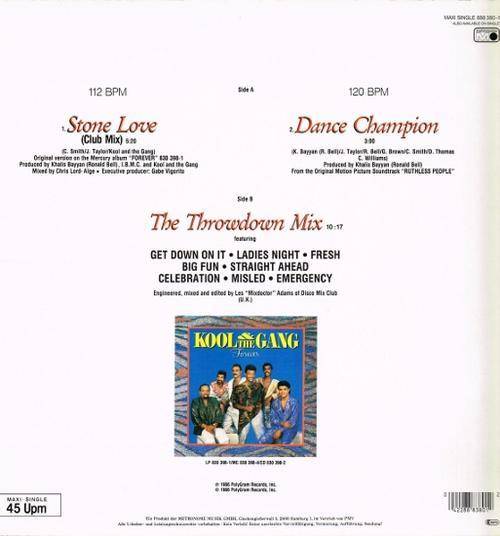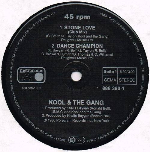 1986 German METRONOME pressing, release number 888 380-1, of 12” Maxi Single by KOOL & THE GANG: Stone Love - Club Mix. The track and other details are as shown on the images, as provided. The record has a few small, faint and ineffective sleeve-scratches, otherwise in a hardly played, excellent condition. The cover has lightly scuffed corners and edges, plus some edge crinkles & light ring-wear, otherwise in a very good plus shape. EX / VG |