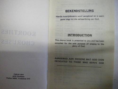 Koortjies/Choruses. 206 Bladsye. Boekie is in goeie kondisie.
