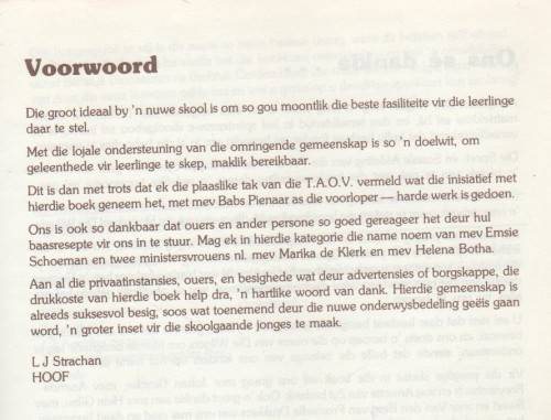 MEV EMSIE SCHOEMAN EN TWEE MINISTERSVROUENS, NL MEV MARIKA DE KLERK EN MEV HELENA BOTHA , ASOOK DIE VROUE VAN DIE PLAASLIKE T.A.O.V. HET BYDRAES TOT HIERDIE BOEK GEMAAK!