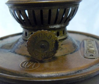 On offer this fabulous vintage oil lamp, standing 34cm tall and with a diameter of 10.5cm. Marked "Cosmos Brenner" as well as a plaque with "Z17622" and embossed with "0,71". The glass chimney made in Czechoslovakia. I am not sure if this is the original glass chimney but it is a good fit. The end of the wick adjuster button comes off when one turns it, this will have to be restored/secured so it stays on when adjusting the wick. Apart from the above a lovely collectible lamp that will be a welcome addition to any collection.