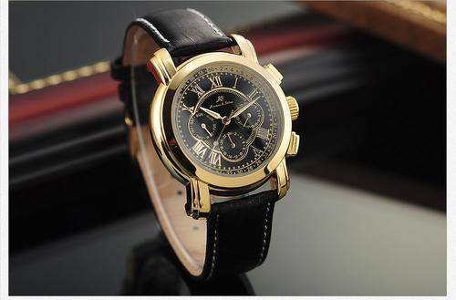 Chronograph, date, day and 24 hour display. Luminous markers and roman numeral indices.