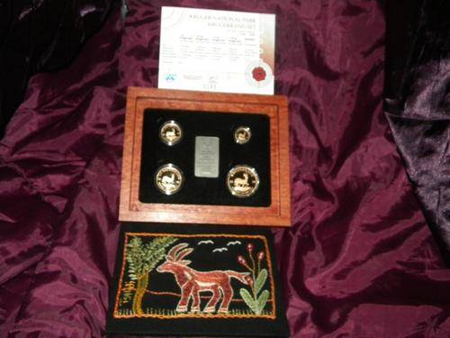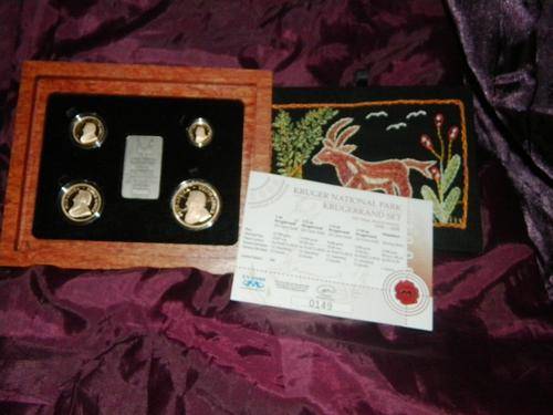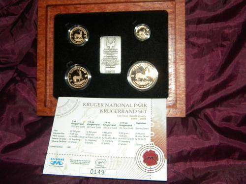 Set 0149 of 400.Kruger National Park krugerrand Set 110 Year Anniversary(1898 - 2008)A limited edition of 400 special Krugerrand sets have been issued,celebrating the 110 year anniversary of the Kruger National Park. This set onsists of the four Krugerrands (1oz, 1/2 oz, 1/4 oz and 1/10 oz) and a silver medallion. The medallion features the logo of South African National Parks and the individual number of the set. The Krugerrands and medallion are packaged in a African Rosewood box with a hand-embroidered inwichs inspired by the Kruger National Park. A community project,Intuthuko, which is based in Soweto, created these unique embroideries.Each of these unique launch sets are issued with an individually numbered of Authenticity. This Certificate of Authenticity guarantees the quaity and authenticity of the coins made by the South African Mint Company.