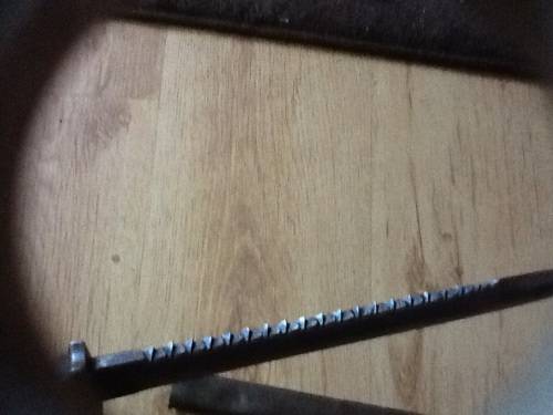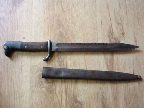 Sawback KS98 mauser bayonet marked EF Horster solingen, manufactured in 1913 inspection marks etc, scabbard a slight dent on ne side and no hook.condition as per pictures. Good beautifull solid blade.