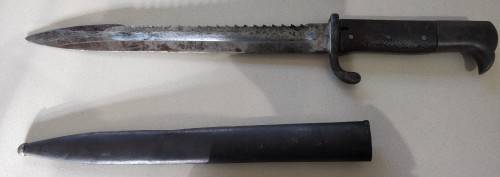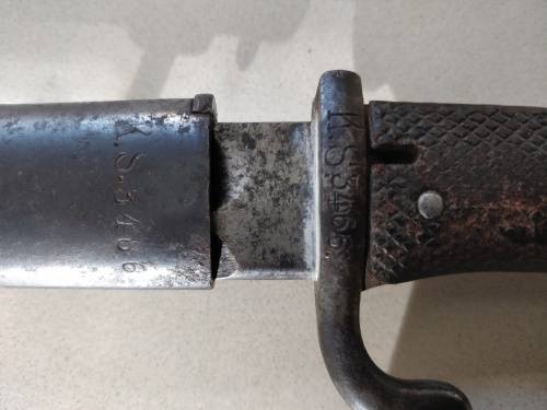 This item is a KS98 Sawback bayonet issued to the Kaiserliche Schutztruppe (German Imperial Colonial Troops) in German Southwest Africa. The maker's mark indicates that it was made in Germany in 1905 by Erfurt.