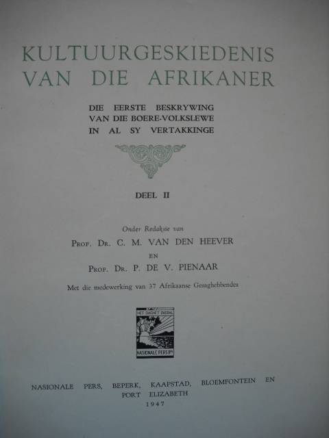 KULTUURGESKIEDENIS VAN DIE AFRIKANER Deel I deur Van den Heever & Pienaar Eerste uitgawe 1947