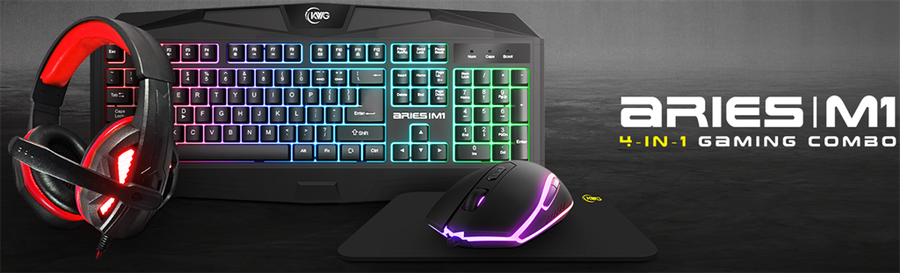 KWG Aries M1 4-in-1 combo unit, includes Gaming Membrane wired Keyboard, Multi-color backlight Spill Resistant Design wired Gaming Mouse Multi-color lighting 3200 DPI for pixel perfect accuracy 6 smart Keys Advanced ergonomic design for every game player, Gaming Headest Multi-color breathing lighting 3.5mm stereo gaming headset 40mm driver unit Omnidirectional flexible microphone, Gaming Mouse Mat 240 x 180 x 3 mm, Retail Box, 1 year warranty