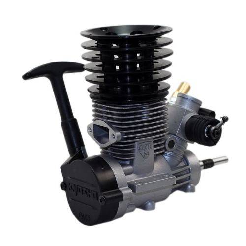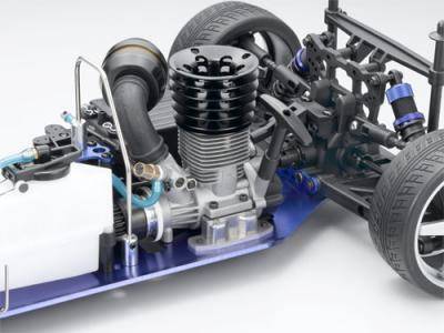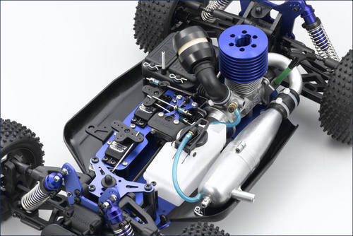 Engine head, main chassis, upper plate and front upper chassis plate are all anodized in black for added strength and surface hardness. | In addition to the black chassis, distinctive blue anodized wheel hubs; shock caps and shock dials are also included. | Includes GX-21BK engine fitted with recoil starter and featuring a black anodized high heat dissipation cooling head as well as a tuned muffler. |