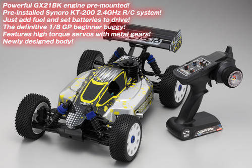 With an unrivalled record of 8 titles at the bi-annual World Championships, the dynamic performance of the Kyosho Inferno has been concentrated into a new hard charging yet easy to drive machine, suitably named the ‘Inferno NEO’. Boasting the Inferno's renowned adaptability on any surface, the NEO features 3.5mm shaft big bore shocks and the same heavy-duty wheels as the high performance MP9, with micro-square pattern tires and resin torque rods (front & rear). A newly designed body with new color scheme also adds superior aerodynamics for awesome speed and easy control. The advanced 2.4GHz Syncro KT-200 control system provides safe and reliable control as soon as it is switched on, without the need to manage frequency bands and is equipped with various additional features that provide precision adjustment of setup. It also includes a fail-safe function that automatically slows the car down in the event of radio signal problems. As the NEO is packaged as a Readyset, you can be charging along at full speed in next to no time just by adding fuel, batteries for the R/C system and engine starting equipment. As the definitive 1/8 GP sports buggy, the Inferno NEO Syncro KT-200 takes you into the thrilling world of off-road racing!
