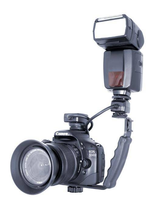 This L-shaped Flash bracket is good for any camera with a tripod socket. The bracket can be mounted to the tripod socket of your camera, Rangefinder or any other camera that does not come equipped with a shoe. This allows the flash to be mounted away from the cameras film plane which eliminates the possibility of red eye. or unwanted shadows. Screws into the tripod socket of the camera to create a shoe mount and handle.