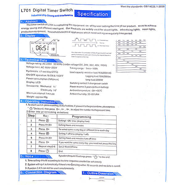 Package weight: 0.03 kgDescription:The timer switch of L701 is controlling the equipment on-off by user setting the time of out product, so as to achieve energy saving and efficient