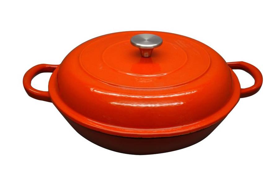 It is made from durable cast iron construction, features an enamel finish and includes a Stainless Steel knob that makes it easy to check the progress of your meal while cooking. This versatile enamel cast iron cookware is compatible with gas, electric, ceramic and induction cooktops. It is ideal to prepare slow-cooked stews and soups, braise meats, fry foods and much more.