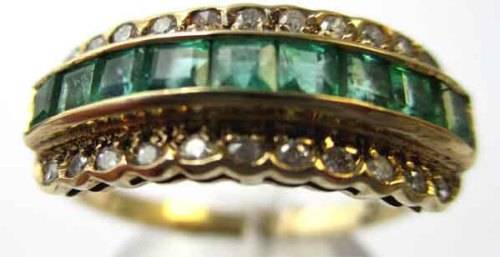 The Sandwana emeralds is square/ princess cut and there are 9 of them with 22 genuine diamonds. It is eye clean with good cut and polish. The current size of this classic ring is a size O 1/ 2 but can be resized.
