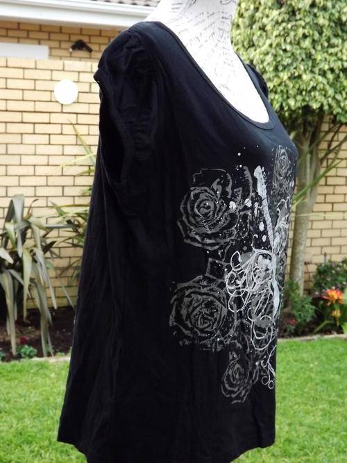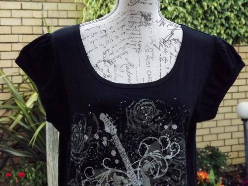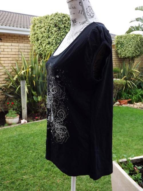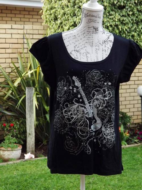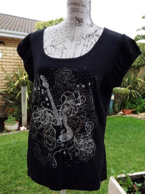 ONE LADIES BLACK CAPPED SHORT SLEEVE T -SHIRT WITH FUNKY GREY AND SILVER ABSTRACT GUITAR PRINT ON THE FRONT . NEW, NEVER BEEN WORN STILL WITH TAG. IN PERFECT NEW CONDITION. SOMETHING THAT WILL LOOK GOOD WITH YOUR FAVOURITE DENIMS, CASUAL CROPPED PANTS OR SHORTS. PERFECT FOR SUMMER ! SIZE EXTRA LARGE.