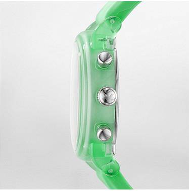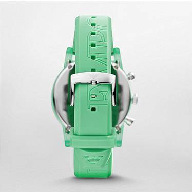 In bold green, this chronograph features a plastic-coated-aluminum case and etched branding on the silicone strap.