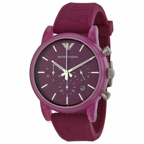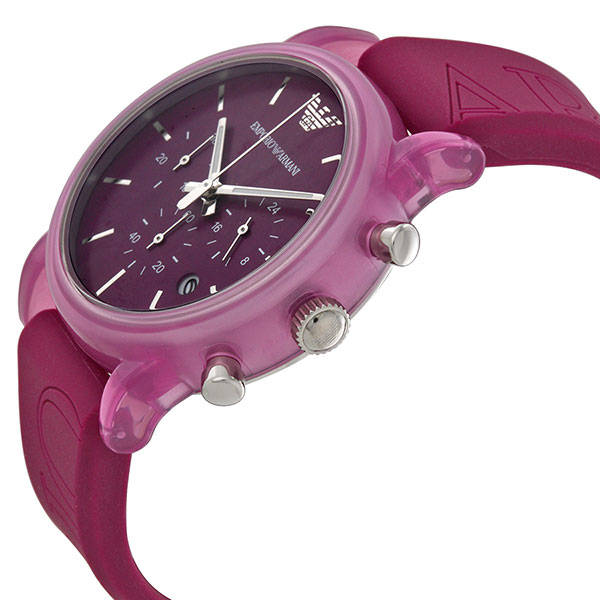 In fuchsia, this chronograph features a plastic-coated-aluminum case and etched branding on the silicone strap.