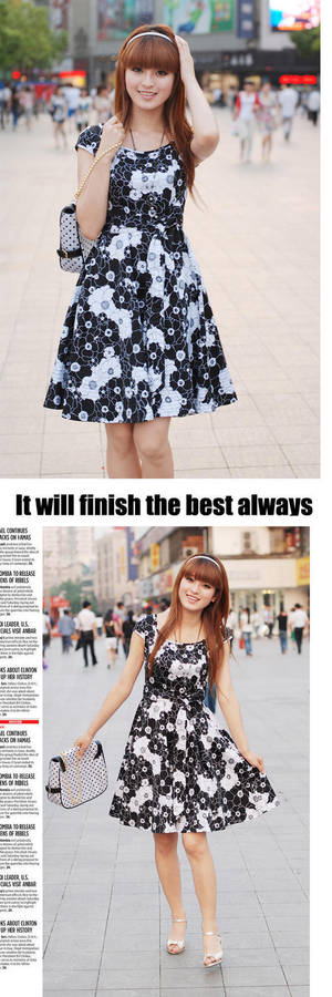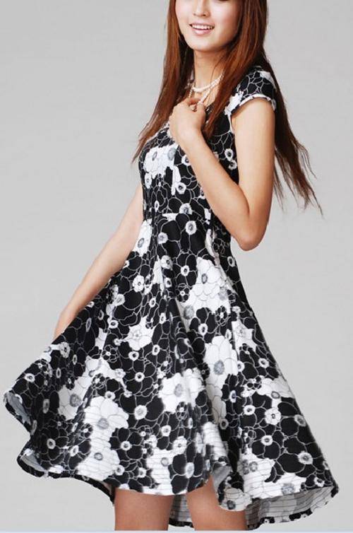 Ladies black floral print dress, cotton fabric, wide hem , hem detail stitching make the hem make wide and flare effect, with fabric belt . Chest 84cm , waistband 74cm, total length 94cm ,